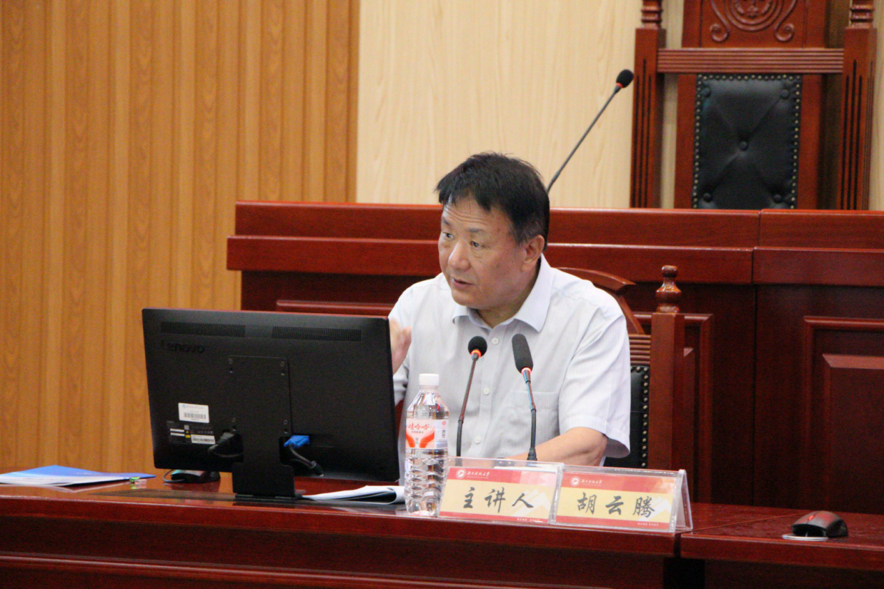 为深入学习宣传贯彻党的二十届三中全会精神和习近平法治思想,完善以实践为导向的法学教育和法学理论研究,2025年6月21日,最高人民法院咨询委员会副主席、中国法学会案例法学研究会会长胡云腾教授应邀在湘江高端论坛暨湖湘法治论坛第153讲作 “推进案例法治的思考” 的学术讲座,讲座由37000cm威尼斯党委委员、副校长余伟健主持,中国人民大学李学军教授、湘潭大学赖早兴教授、37000cm威尼斯蒋兰香教授担任与谈人,众多法学界人士及百余名法学学生到场聆听。